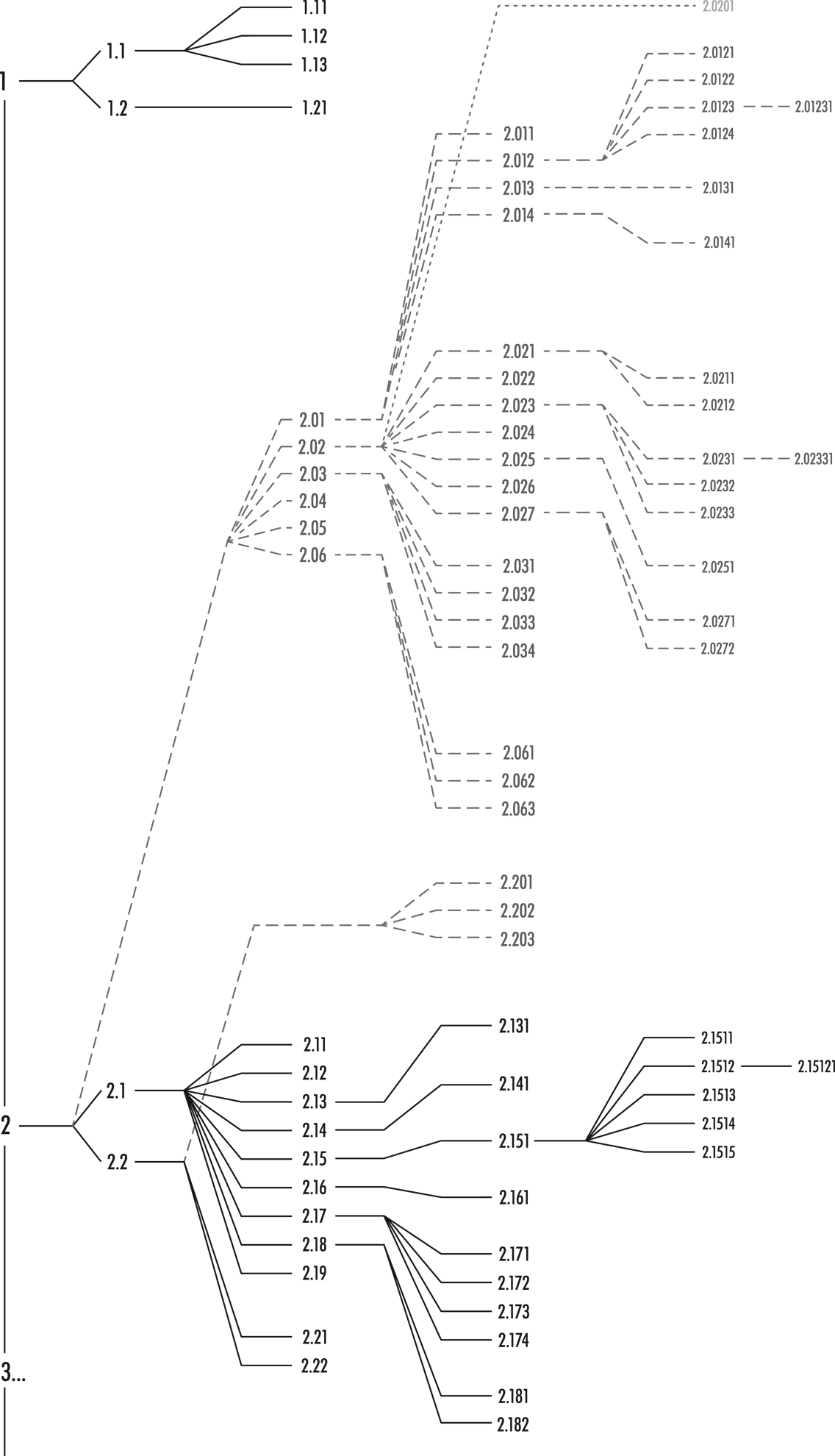 Опираясь на древовидную структуру «Трактата», которая была очевидна даже в предыдущих «линейных» изданиях, где все пункты рассуждений автора печатались последовательно [30], мы в настоящем издании воспроизводим текст Витгенштейна в виде иерархического логического дерева — как это сделано в Centenary Edition со ссылкой на обнаруженный в дневниках автора так называемый «Прото-Трактат» и иные записи (подробнее см. «Предисловие»). Эта иерархическая структура, своего рода гипертекст (придуманный Витгенштейном еще тогда, когда само понятие фактически отсутствовало [31]) наглядно показывает авторский ход мысли — и значительно облегчает понимание «Трактата», упорядочивая изложение тематически и содержательно.