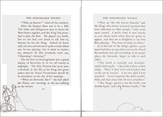 “You are a very irritating person,” said the Rocket, “and very ill-bred. I hate people who talk about themselves, as you do, when one wants to talk about oneself, as I do. It is what I call selfishness, and selfishness is a most detestable thing, especially to any one of my temperament, for I am well known for my sympathetic nature. In fact, you should take example by me; you could not possibly have a better model. Now that you have the chance you had better avail yourself of it, for I am going back to Court almost immediately. I am a great favourite at Court; in fact, the Prince and Princess were married yesterday in my honour. Of course you know nothing of these matters, for you are a provincial.”