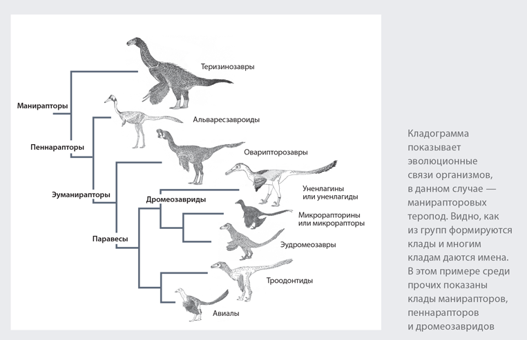 Проблема с линнеевскими рангами заключается в том, что люди, в том числе ученые, склонны считать, что количество анатомических вариаций у разных групп животных одинаково. Иными словами, что представители одного отряда или семейства нептичьих динозавров и древних птиц отличаются друг от друга так же, как, скажем, представители семейства или отряда современных млекопитающих. Но это не так. Линнеевы ранги для разных групп животных сильно отличаются, как и вариации, которые они охватывают. Отчасти поэтому многие биологи и палеонтологи отказались от рангов Линнея и сочли более полезным просто давать названия соответствующим кладам. Они перешли к системе под названием филогенетическая систематика, или кладистика[2]. В ней можно давать название любому множеству животных, если оно является кладой — группой организмов, в которой все виды происходят от единого предка.