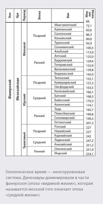 Когда речь идет о вымерших нептичьих динозаврах и других ископаемых организмах, часто приходится ссылаться на их геологический возраст. Например, Tyrannosaurus rex родом из мелового периода — временного промежутка между 145 и 66 млн лет назад. Если конкретнее, тираннозавр относится к позднему мелу, который длился от 100 до 66 млн лет назад. Еще конкретнее, он относится к маастрихту — так называется один из веков позднего мела, продолжавшийся с 72 до 66 млн лет назад. Как правило, виды динозавров существовали примерно от 1 до 3 млн лет, а потом вымирали. Ни один вид не жил на протяжении всего позднего мела, не говоря уже обо всем меловом периоде. Поэтому эксперты считают полезным использовать названия веков (например, маастрихт), когда речь идет о геологическом возрасте динозавров. В этой книге мы, как правило, не используем названия веков.