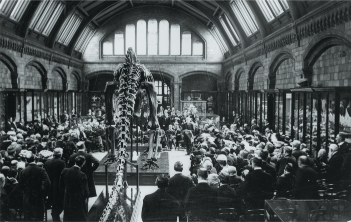 В начале 1900-х гг. промышленник и филантроп Эндрю Карнеги оплатил изготовление копий скелета диплодока, которые потом были отправлены в Лондон, Париж и другие города[4]. На фото: открытие лондонского экспоната — сегодня известного как Диппи — в мае 1905 г.