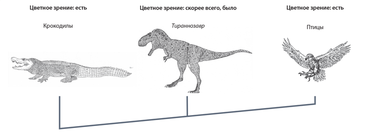 Этот метод называется филогенетическим брекетингом (или просто брекетингом), и он регулярно используется для ответа на вопросы об анатомии, биологии или поведении ископаемых животных. Простой пример: давайте подумаем, какое зрение было у тираннозавра. Хорошо ли он видел? Мог ли различать цвета? Если посмотреть на современных крокодилов и птиц, мы увидим, что у обеих групп отличное зрение, причем цветное. Таким образом, при отсутствии лучшей информации можно заключить, что то же самое было верно и для тираннозавра.