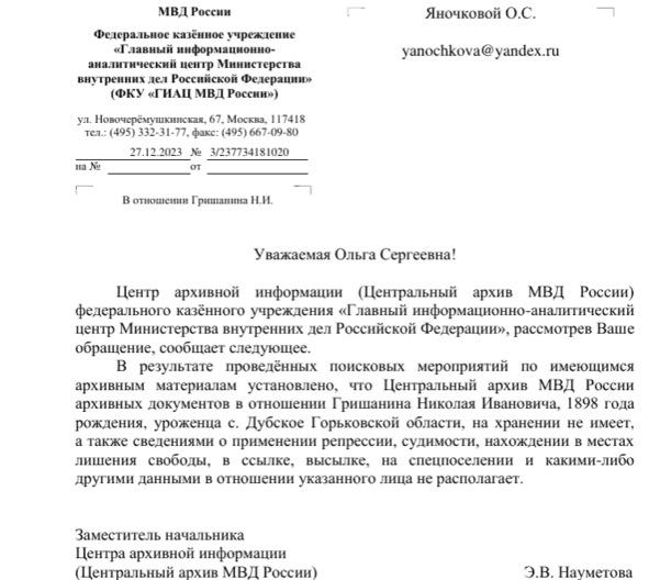 Между тем официальный ответ его сыну (моему отцу), в послевоенные годы гласил, что Гришанин Николай Иванович был приговорен к 10 годам без права переписки. Была ли это отписка «от балды», не опираясь на документы, или документы все же были, но с другими формулировками?