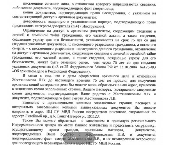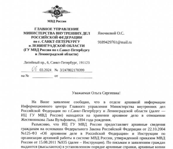 Кроме «облома» с дедушкиным делом, нас постигла и еще одна неудача. Выяснилось, что на бабушкиного брата Льва тоже существует уголовное дело, но получить его представляется маловероятным. Как ни странно, ФСБ выдает (хотя бы частично) копии дел. Так Ольга получила дела на бабушкину сестру Эсфирь и брата Якова. А про Льва она получила ответ, что дело передано в МВД. Ответ МВД можно приводить как шедевр бюрократического мастерства. Список необходимых документов таков, что его в принципе невозможно собрать. Читайте и наслаждайтесь!