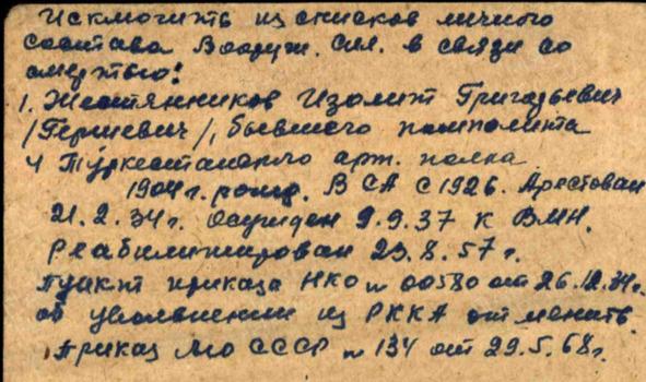 В нем одна описка — дата ареста названа на два месяца позже реальной, но это не принципиально. Что он был арестован раньше очевидно из формулировки об увольнении из армии от 26.12.1934. Про первоначальный приговор — 5 лет ИТЛ — здесь ничего не сказано, зато однозначно понятно, что Жестянников Изолит Григорьевич, бывший помполит 4-го Туркестанского артиллеристского полка, был осужден 9.09.1937 года (то есть более чем через 3 года после ареста) к высшей мере наказания. И указана точная дата реабилитации — 23.08.1957.