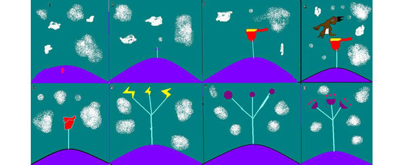 Сначала попадает в почву семечко, дает росток, потом появляется коробочка больших размеров. В эту коробочку залезают утки — им кажется, там есть что-то съедобное. И как только они залезают, коробочка сасафлора захлопывается и переваривает утку. К счастью, как я уже говорила, когда умирает одна утка, вырастает три новых. Когда сасафлор поймает десять уток, у него появляются листья. Они маленькие, жёлтенькие, в форме молнии. Кстати, у сасафлора голубой ствол. Потом появляются самые разные плоды — у разных видов сасафлора они разные. На месте каждого листочка — по плодику. Из каждого плодика выскакивает по три семечка, и они начинают давать ростки. Вот как живет сасафлор. Он живет в моем придуманном мире. На самом деле такого дерева нет.