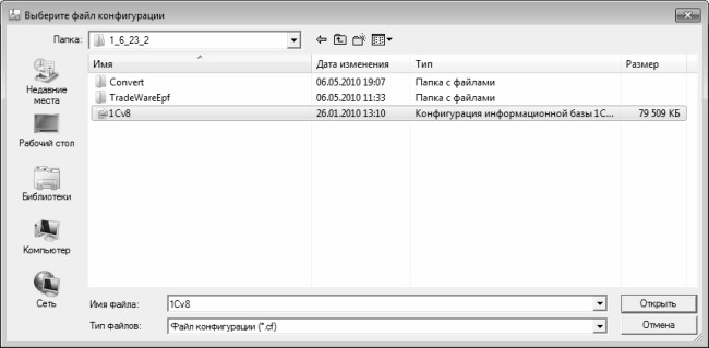 В данном окне нужно указать путь к файлу конфигурации, выделить этот файл щелчком мыши и нажать кнопку Открыть. Сразу после этого начнется процесс загрузки конфигурации. Информация о ходе данного процесса будет демонстрироваться в строке состояния в нижней части окна Конфигуратора.