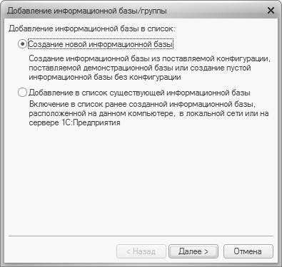 Для перехода к следующему этапу нажмите кнопку Далее. При создании новой информационной базы на экране отобразится окно, которое показано на рис. 1.6.