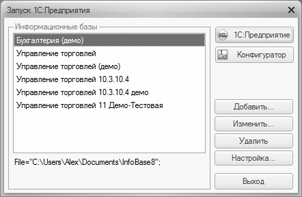 В центральной части окна запуска программы представлен список информационных баз. При первом запуске программы в данном списке может присутствовать информационная база с демонстрационной конфигурацией; эта база входит в комплект поставки и предназначена для предварительного знакомства с системой. Выбор информационной базы осуществляется щелчком мыши на соответствующей позиции списка. Вы можете добавлять в список новые либо редактировать и удалять имеющиеся информационные базы – о том, как это делать, будет рассказано ниже.