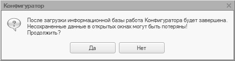 По окончании загрузки программа выдаст запрос на обновление конфигурации базы данных. На этот запрос следует ответить утвердительно. Информация о ходе процесса обновления также будет отображаться в строке состояния. При этом программа выдаст еще один запрос – на принятие изменений конфигурации, на который также следует ответить положительно (в противном случае обновление завершено не будет).