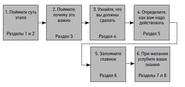 В первой главе дана вводная информация, с которой необходимо познакомиться, прежде чем вы возьметесь за управление проектами. Главы со второй по пятую представляют собой пошаговое руководство по управлению проектом. Но не обязательно изучить всю книгу от начала до конца, прежде чем использовать эти знания на практике. Можно читать главу за главой и шаг за шагом применять описанный подход.