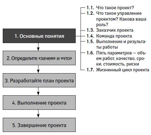 Книга последовательно, шаг за шагом, описывает алгоритм управления проектами. Каждый шаг — это этап развития проекта. Структура книги полностью соответствует очередности этих этапов.