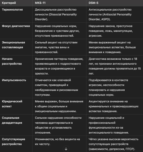 • Фокус: DSM-5 акцентирует внимание на юридических аспектах поведения (преступления, нарушения закона), в то время как МКБ-11 делает больший упор на нарушении социальных норм и отсутствии эмоциональной привязанности.