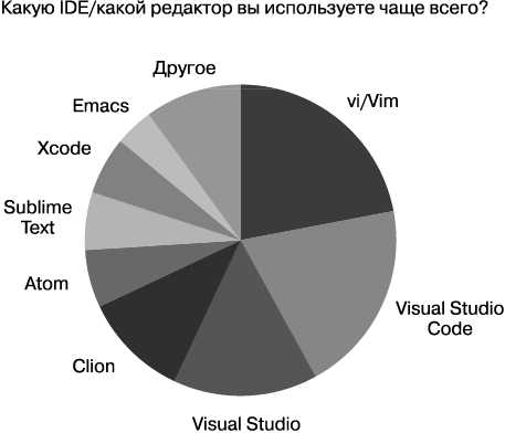 Для разработки программ на C можно использовать всевозможные редакторы и IDE. На рис. 1.1 перечислены самые популярные из них, согласно исследованию JetBrains за 2018 год.