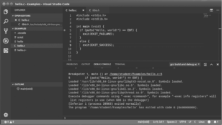 Visual Studio Code (VS Code) — это удобный в использовании редактор кода с поддержкой таких аспектов разработки, как отладка, запуск заданий и управление версиями (подробности — в главе 11). Он предоставляет именно те инструменты, которые нужны программисту для быстрого цикла «программирование — сборка — отладка». VS Code работает на macOS, Linux и Windows и бесплатен для личного и коммерческого использования. Инструкции по установке доступны для Linux и других платформ6; в Windows вы, скорее всего, остановите свой выбор на Microsoft Visual Studio. На рис. 1.2 показан редактор Visual Studio Code в Ubuntu, с помощью которого написана программа из листинга 1.1. Как видно в консоли отладки, программа, как и ожидалось, вышла с кодом состояния 0.