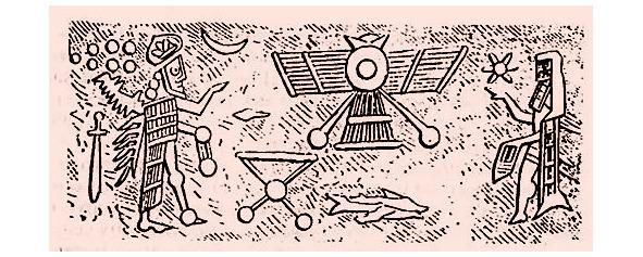 Изображение Земли и Марса с летящим космическим объектом на древнешумерской таблице. В прилагаемом тексте поясняется, что Земля обозначается семью точками, как седьмая планета