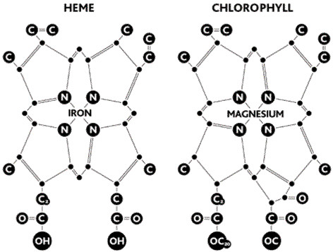 Молекула слева – химическое изображение гема. Гем – это часть гемоглобина, переносящая кислород, и соответственно важная составляющая человеческой крови. Справа изображена молекула хлорофилла. Как вы можете видеть, обе молекулы очень похожи по структуре. Основное различие заключается в том, что в центре гема находится атом железа, в то время как в центре хлорофилла – магний. Я считаю это сходство доказательством большого значения хлорофилла для нашей крови, а также для всего тела, потому что хлорофилл – в сущности, сжиженный солнечный свет – является чудесным веществом. И он действительно творит чудеса исцеления в человеческом организме.
