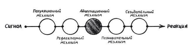 Изначально мы рассматривали мыслительный процесс и его «предков», таких как механизм превращения сигнала в реакцию, и дальше будем делать так же. Только теперь будем говорить не об одном таком механизме, а о нескольких. Связаны между собой они очень просто: каждый следующий может прервать и видоизменить реакцию предыдущего. И чем больше таких систем прерывания, тем сложнее поведение животного.