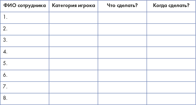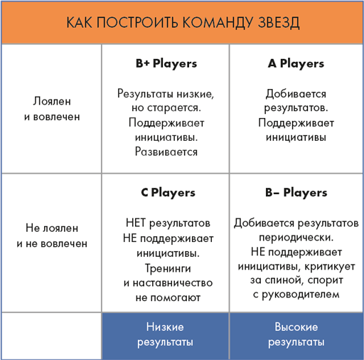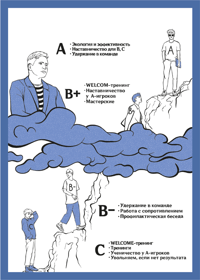 Самая сложная задача — поднять игроков из группы С. К сожалению, вернуть горящие глаза достаточно сложно, когда человек негативно относится к инициативам компании и ее продуктам, когда это B–. Если руководитель все же видит потенциал работника и считает, что его можно вернуть в команду, то проблему нужно проговорить с ним лично, постараться выяснить причины низких результатов и отсутствия должной вовлеченности, обсудить возможные выходы из ситуации. И если огонек внутри человека все еще тлеет, то потребуется искра, чтобы вновь его разжечь. Стратегия руководителя будет заключаться в том, чтобы сначала поднять С-игрока до уровня B+, а потом вести его на вершину А. Можно организовать обучение или тренинг, где человек научится позитивно относиться к сложным ситуациям, можно сделать ставку на наставничество со стороны А-игрока, который попробует расшевелить энтузиазм коллеги, заразив его своей энергией… Но если время идет, а принятые меры не помогают обнаружить скрытые резервы, то с C-игроком нужно прощаться. Особенно безнадежны ситуации, когда игрок опустился на С с уровня B–. Возвращать его в прежнюю парадигму результативного недовольства будет малоэффективно. Здесь руководитель должен быть достаточно жестким, чтобы объяснить, что лояльность будет ключевым условием продолжения работы в команде.