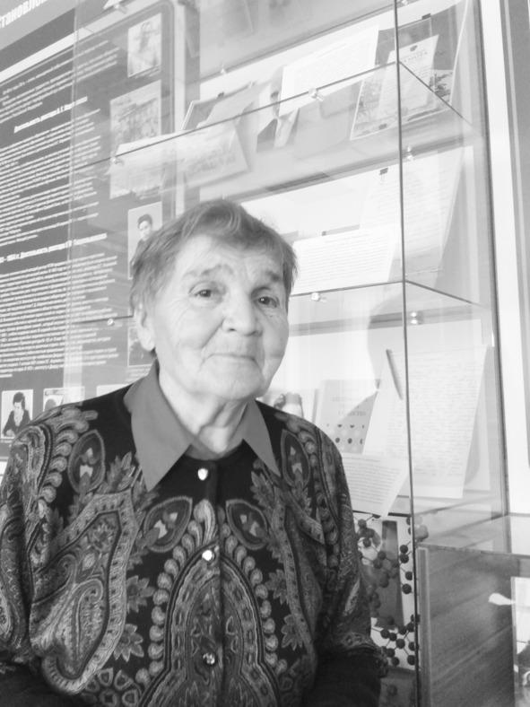 Анна Ивановна Петрашева (Баркова) у музейного стенда, посвященного отцу, Ивану Яковлевичу Баркову, в музейно-выставочном комплексе Южно-Уральского государственного гуманитарно-педагогического университет (ЧГПУ)