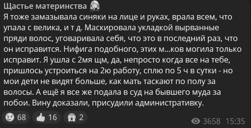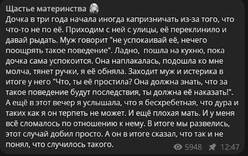 Прилетело извещение о новом посте в любимом паблике. Женщина анонимно делится историей, что муж уговаривал на ребенка, а потом бросил беременную. И сейчас она без денег, без работы, с ревущим ребенком на руках, с недосыпом спрашивает у подписчиц, как ей жить дальше. Женщины в комментариях делятся, как с ними произошло нечто подобное. В итоге обсуждение скатывается в ужасные физиологические описания родов, разрывов, опущений органов. Их прерывают другие, говоря, что роды – это еще цветочки, ягодки идут, когда дети взрослеют. Мамы жалуются, что даже в туалет не могут сходить одни. Другие поддакивают и рассказывают, как они с появлением детей отказались от хороших работ и сейчас выживают на МРОТ. А что делать – женщина с ребенком проигрывает в корпоративной гонке более свободным специалистам.
