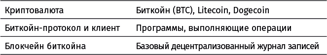 В терминах легко запутаться, потому что слова «биткойн» и «блокчейн» могут обозначать любую из трех частей концепции: базовую блокчейн-технологию, протокол и клиента, обеспечивающие выполнение транзакций, и собственно криптовалюту (деньги). Кроме того, эти термины могут применяться для обозначения и концепции криптовалют. Это все равно что называть термином «PayPal» сам интернет, через который работает протокол PayPal, служащий для перевода валюты PayPal. В блокчейн-индустрии эти термины часто смешиваются, поскольку пока не завершился процесс формирования общепризнанного многоуровневого стека технологий.