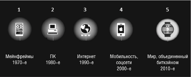 Рис. П-1. Революционные парадигмы вычислений: мейнфреймы, ПК, интернет, социальные и мобильные сети, блокчейн [8]