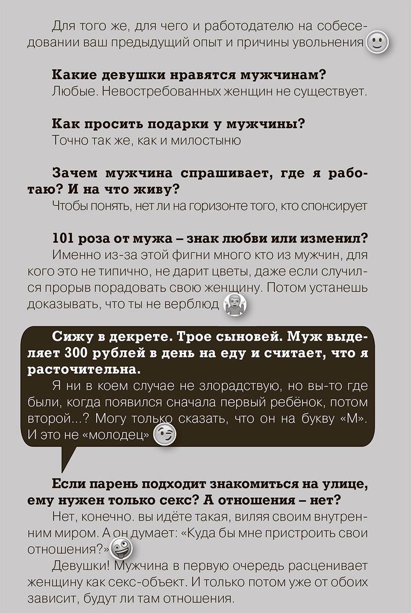 Книга рассчитана на мужчин и женщин в возрасте от 16 до 60 лет. Прочитав эту книгу, вы поймёте логику мужчин и женщин, разберётесь, как правильно вести себя в той или иной ситуации. А также найдёте ответы на самые популярные вопросы: