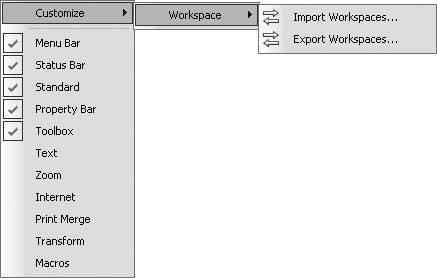 Кроме уже упомянутых главного меню (пункт Menu Bar на рис. 2.2), строки состояния (Status Bar), стандартной панели (Standard), панели свойств (Property Bar) и панели инструментов (Toolbox), можно активизировать следующие дополнительные панели: