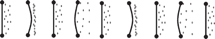 Звук – это движение. Когда дергают гитарную струну, она заставляет двигаться воздух в ближайшем окружении. На рис. 1.1 изображены колебания гитарной струны после щипка. Слева показана струна в свободном состоянии, и справа от нее – дюжина маленьких молекул воздуха. Когда гитарная струна находится в покое, локальное атмосферное давление составляет около 14,7 фунта на квадратный дюйм – давление воздуха на уровне моря. Когда струну дернули, она быстро отклоняется вправо и молекулы воздуха прижимаются ближе друг к другу, создавая более высокое давление[9]. Затем, через очень небольшой промежуток времени (сотые или тысячные доли секунды в зависимости от высоты ноты), гитарная струна движется в обратном направлении, минует исходное положение и смещается чуть левее. Тогда молекулы воздуха справа опять рассеиваются, и давление снижается. Но молекулы не возвращаются сразу к исходному состоянию, как было до натяжения струны. Теперь они рассеяны чуть в большей степени (занимают больший объем) и, следовательно, создают меньшее давление, чем было до первого движения струны. Затем они опять сжимаются, и опять рассеиваются, и еще, и еще, каждый раз чуть слабее, и, наконец, движение прекращается, вибрация затихает, звук умирает. Движение было звуком, и когда движение прекратилось, прекратился и звук.