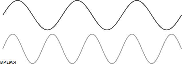Высота – это то, что отличает “высокий” звук от “низкого”. Звук флейты мы называем высоким, а звук тубы – низким. То, что мы слышим и описываем этими терминами, является проявлением физического свойства частоты. Мы слышим высокий звук, когда колебания от высокого давления воздуха к низкому происходят очень быстро – с высокой частотой. Низким звукам соответствуют более медленные изменения давления воздуха – с низкой частотой (рис. 1.3). Высота звука – это категория восприятия, а частота – измеряемое физическое свойство. Нам следует хорошо понимать разницу между высотой и частотой, поскольку они не всегда идеально коррелируют.