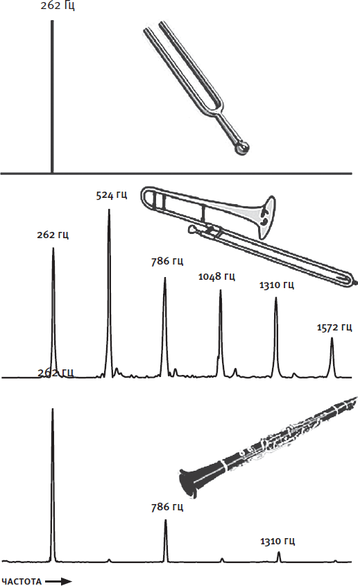 Рис. 1.5. Спектр камертона представляет собой единственную вертикальную линию на одной конкретной частоте – в данном случае 262 Гц, что соответствует ноте до первой октавы. В звуковом спектре инструмента, исполняющего ноту до, есть пик на частоте 262 Гц, а также несколько гармоник на кратных частотах. Звук “до” первой октавы в исполнении тромбона или кларнета имеет разный рисунок гармоник из-за резонансных характеристик этих инструментов. Спектры помогают понять, почему одна и та же нота до первой октавы звучит по-разному в исполнении разных инструментов (по оси x отложены частоты, по оси y – энергия).