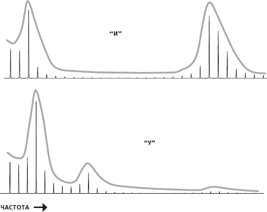 В зависимости от положения губ и языка и от объема проходящего через рот и нос воздуха мы изменяем спектр издаваемого звука (какие-то из гармоник усиливаются), как показано на рис. 1.6. Хотя в спектре двух гласных звуков есть пики, отстоящие друг от друга на 100 Гц (поскольку в данном примере основная частота составляет 100 Гц), высота пиков, изображенных серыми линиями, очень разная. Это речевой аналог разницы между звуками тромбона и кларнета. В случае звука “и” два максимума серой линии приходятся на частоты 300 и 2300 Гц, в случае звука “у” они располагаются примерно на частотах 400 и 1000 Гц. Спектр речи имеет выпуклости – области с максимумом энергии, называемые формантами. Интересно, что эти полосы акустической энергии достаточно похожи у разных людей. Человек с высоким голосом имеет пики для звука “у” где-то в районе частот 400 и 1000 Гц, как и человек с низким голосом.