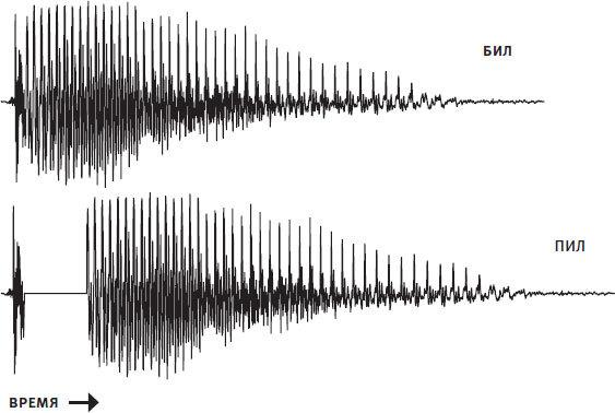 Произнесите вслух слово “был”. А потом слово “жил”. Можете описать, чем различаются механические движения вашего рта? Это довольно просто. В первом случае ваши губы смыкаются, а язык занимает некую нейтральную позицию. Во втором случае губы слегка приоткрыты, а задняя часть языка прижата к небу. А теперь скажите “бил” и “пил”. Это сложнее. В чем тут разница? Механическая разница между произнесением “б” и “п” не так уж очевидна. Язык и губы в обоих случаях находятся фактически в одном и том же положении. Основное отличие заключается во временной развертке – когда вы начинаете произносить гласную, то есть когда голосовые складки начинают издавать звук “и”. Произнося слово “бил”, вы включаете голос почти сразу. Однако при произнесении слова “пил” между тем, как ваши губы раскрываются, и тем моментом, когда вы начинаете произносить гласный звук, имеется очень короткий промежуток времени. В верхней части рис. 1.8 изображена звуковая волна слова “бил”. В нижнюю волну я включила паузу длительностью 1/20 секунды. Все колебания двух линий идентичны, за исключением этой добавленной паузы. Небольшой паузы до начала произнесения “и” достаточно, чтобы вторая волна отчетливо звучала как “пил”. Различие во времени в несколько долей секунды создает значительное различие в речи. Это одна из многих причин, почему для обработки таких едва заметных изменений звука нам с вами требуется сверхбыстрый слуховой мозг.