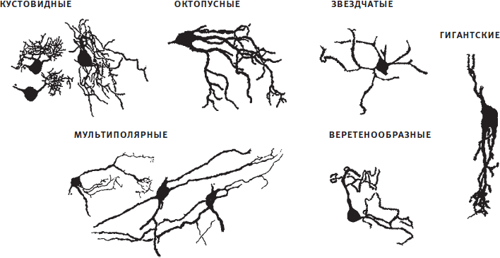 Улитковое ядро. Первой структурой на пути к слуховой коре после возникновения электрического сигнала в месте соединения улитки со слуховым нервом является улитковое ядро. В нем содержится множество типов клеток с замечательными названиями (кустовидные, веретенообразные, октопусные!)[20] и характеристиками ответа[21], необходимыми для выполнения их работы. На рис. 2.5 я показываю, как выглядят эти клетки, просто потому, что мне они кажутся изумительными[22].