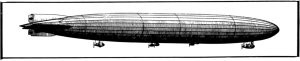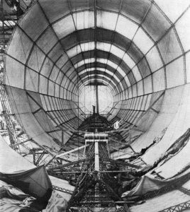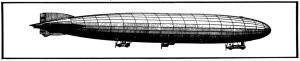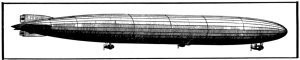 It was a huge thing in those days, 419.8 feet long (128 meters), with a diameter of 38.3 feet (11.7 meters). It was made up of an immense aluminum framework including 24 longitudinal girders running from nose to tail and drawn together at the ends. Joining the girders were 16 rings, (reinforced with diagonal wires), formed of transverse girders, which held the body together. On the bottom side of the body was fixed a bridge-like construction which strengthened the framework sideways and attached to it were two motor gondolas.