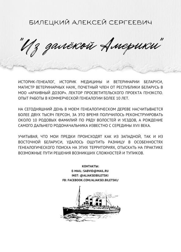 Анна села на корабль под названием «Балтик» (Baltic), покинувший порт в Ливерпуле 13 августа 1914 года. В заветную страну, а точнее в самый крупный пункт временного пребывания иммигрантов на острове Эллис, она приплыла из Англии через девять дней, а именно 22 августа 1914 года [6], т. е. на 25-й день после объявления о начале «Великой войны». Последнее событие стало основной причиной, чтобы задержаться на чужбине и впоследствии пустить там корни. Тем не менее не помню разговоров родственников, чтобы переселенцы стремились, а тем более посещали родные места уже в межвоенное время, когда лояльное Польское государство, установившееся на западе современной Беларуси, нисколько не преследовало и не препятствовало трудовым мигрантам.
