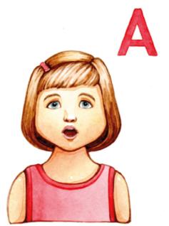 Тата умеет широко открывать рот. (Логопед показывает артикуляционную позу звука [а].) Попробуй сделать так же. (Если у ребёнка не получается, аккуратно опустите его нижнюю челюсть чистой рукой.) Теперь послушай, как Тата поёт: «А-а-а!» (Педагог показывает картинку с девочкой и обращает внимание ребёнка на букву А.) А ты мне так споёшь? Нет? (Взрослый задаёт вопросы и отвечает на них.) Тогда давай споём вместе.