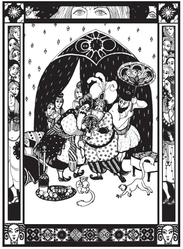 Волшебник принарядился. Надел сразу три богатых халата. Снизу — белый шелковый, на него — багряный атласный, а сверху — золотой парчовый. На голову водрузил огромный пестрый тюрбан, украшенный жемчужными нитями и павлиньими перьями. И препоясался саблей в ножнах, усыпанных драгоценными камнями.
