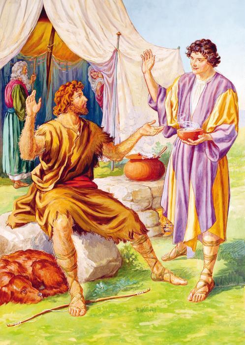 Однажды Исав пошёл на охоту в поле и вернулся домой голодный и усталый. А Иаков, который оставался дома, приготовил себе похлёбку из чечевицы. Эта еда похожа на наш варёный горох. Кушанье уже стояло на столе, когда вошёл Исав.