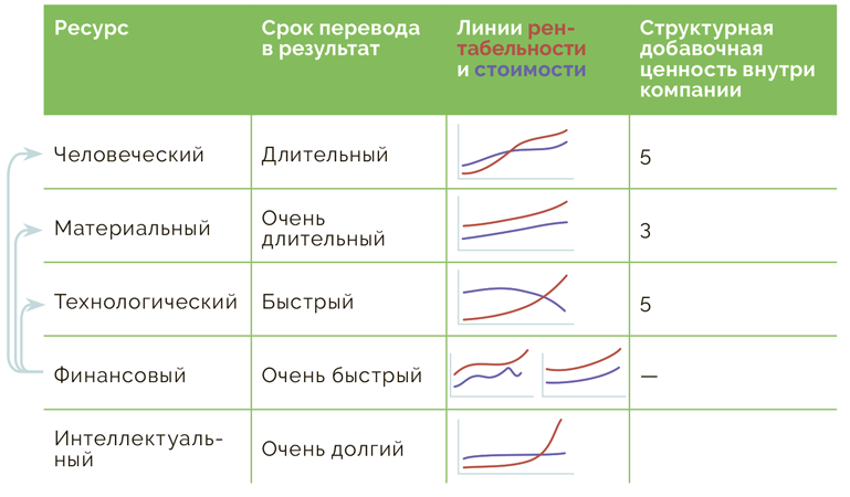 У всех компаний разные ресурсы хранятся по-разному. Например, в риелторском бизнесе в том числе важны такие ресурсы, как количество риелторов, объем клиентской базы, узнаваемость бренда. У нас есть эффективность использования ресурсов и их накопления. Это своего рода дебет и кредит в любой момент времени. В других видах бизнеса, например гостиничном, ресурсы вкладываются в материальные активы, качество сервиса и имя бренда. В сфере услуг больший акцент делается на человеческом факторе, в банковской сфере — на финансовых ресурсах. Но всегда есть какой-то способ хранения этих ресурсов.