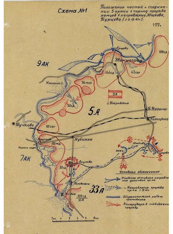 1. Третий б-н 1089 сп, усиленный 3 орудиями ПТО (45 мм), подходя к с. Криволучье в 8.00 14.12.41. был атакован с фронта 3 танками, а затем 2 танками с фланга с дистанции 500–600 метров. По команде командира батальона капитана Мильера, бат-н беспорядочно начал развертываться под уничтожающим огнем танков противника. Орудия ПТО, сделав по несколько выстрелов, вышли из строя. Шедшая впереди батальона разведка в количестве 10–15 человек на дистанции 50 метров, естественно не могла предупредить б-н о танках противника, других же мер охранения у бат-на не было, а так как батальон шел в походном порядке, развертывание запоздало. Танки противника начали охватывать б-н с трех сторон давя живую силу, обоз и орудия. В результате 30 минутного боя (бойцы и командиры отстреливались из винтовок по танкам) батальон потерял до 150 чел. убитыми и до 60 ранеными. В числе убитых к-р б-на Мильер, комиссар б-на и весь комсостав 9 и 8 рот.