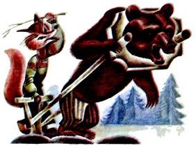 Сели они друг против друга на кочки. Медведь басом заревел, лиса завыла тонко. Изо всех сил медведь старался, пасть широко разинул, а глаза закрыл. Ревет — ничего не слышит, ничего не видит. Лиса с кочки скок, за кусток юрк и — поминай как звали. Когда медведь замолк, открыл глаза — лисы давно и след простыл.