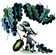 Только мышка зашла в лес как вдруг на голову ей свалился с дуба желудь. Со страху в глазах у мышки помутилось, бросилась она со всех ног сама не зная куда. Бежит, дороги не разбирая. А навстречу ей крыса.