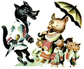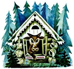 Долго они жили или не долго, но как-то идет мимо волк, видит новую избушку и думает: "Сколько раз я тут пробегал, пусто было. А теперь кто-то дом построил. Ну-ка, погляжу, кто в нем живет. Заодно пообедаю с хозяевами».