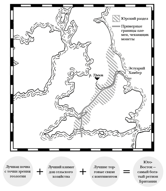 Они потерпели неудачу. В регионе, известном ныне как Шотландия, жители сопротивлялись так успешно, что римлянам пришлось откатиться за оборонительные валы, которые можно увидеть и сегодня. Современный Уэльс и север Англии всегда управлялись и облагались налогами силой, размещенной на наконечнике копья. Римская цивилизация в Британии, по сути, размещалась только на юге Англии. Подлинной романизации подверглись лишь районы вдоль крупных дорог, которые вели к северному бастиону, Йорку, и соединяли важнейшие гарнизоны — Карлеон и Честер (контуры этой последней дороги практически соответствуют современной западной границе Англии). Таким образом римляне, до прихода которых жители Юго-Востока и так отличались от соседей, сделали эти различия еще более явственными.