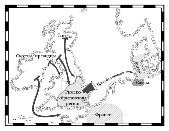 Но эти варвары не были саксами. Гильда вообще не упоминает о германских племенах в это время. Смертельными врагами цивилизации в Британии были два чуждых народа: скотты с северо-запада (в том числе из Ирландии) и пикты с севера, приплывавшие на кораклах [3]. Поскольку Рим помочь уже не мог, романизированные бритты обратились к другим европейцам.
