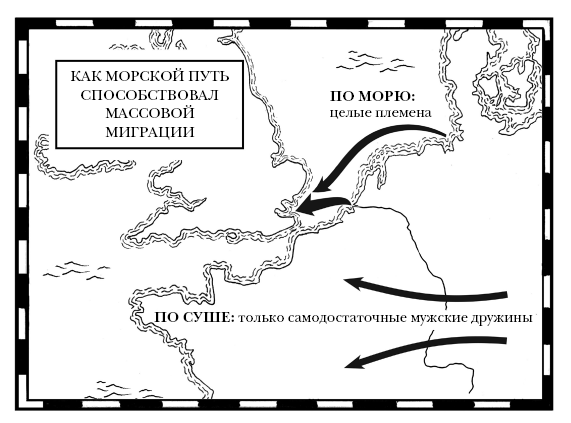 Так почему германские переселенцы остаются германцами только в Англии? Частично это произошло потому, что Британия к тому времени уже находилась в упадке и превратилась в землю, управляемую местными вождями, которых Гильда Премудрый называет тиранами. Пришедшие англы нашли одни лишь развалины. Не увидев ничего, что можно было бы перенять, они остались верны собственной культуре. Это удалось им благодаря другому важному фактору — морю. Ла-Манш не защищал Британию, а, напротив, делал возможным ее полное завоевание. Повсюду в Европе германские завоевания были делом вооруженных дружин, состоявших только из мужчин. Все племя целиком, включая стариков, кормящих матерей, маленьких детей, не могло пережить длинные переходы по суше на враждебной территории. А вот англы могли за день-два морем отправить целые кланы на Саксонский берег, где их ожидали удобно построенные и хорошо знакомые римские порты.