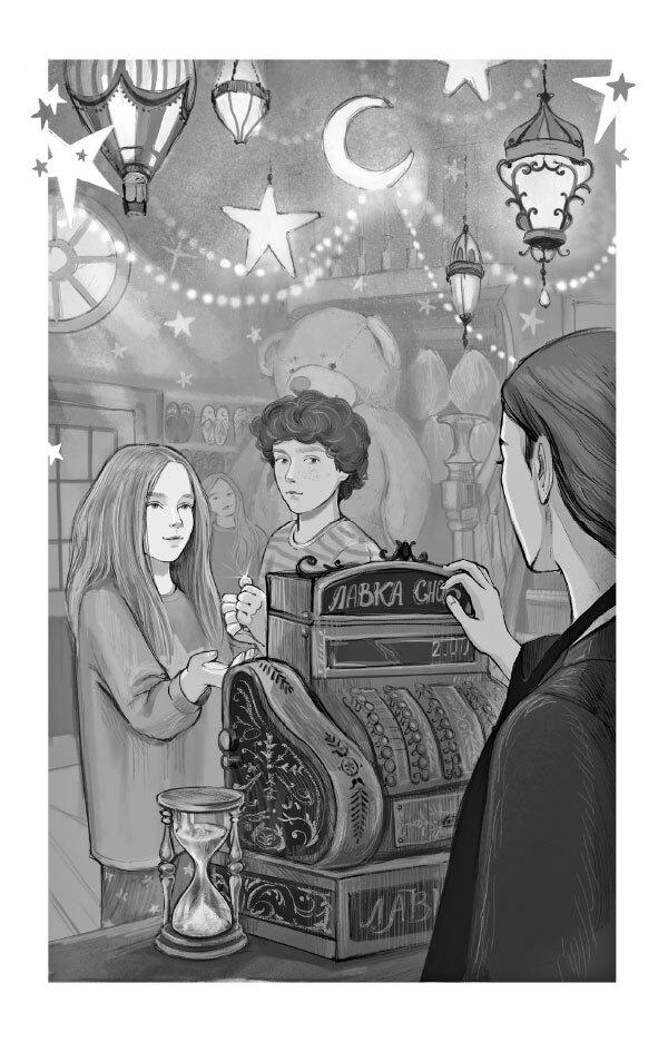 И тут одна звёздочка моргнула ей, потом вторая, и вдруг всю комнату залило ярким светом! Соня растерянно захлопала глазами. Она оказалась перед прилавком магазина. За массивным кассовым аппаратом стояла девушка в строгих очках. Полки позади прилавка были заставлены разноцветными коробочками, вокруг которых летали светлячки. Возле прилавка ходили мальчики и девочки, одетые в пижамы и тапочки. Соня оглядела себя: она сама оказалась в пижаме, в которой уснула. Вот чудеса!