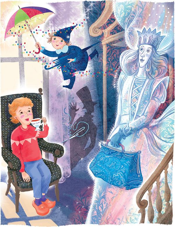 В доме Андерсена творилось то же, что и всегда. Кресло ворчало сказки и хромало по всей комнате. Штопальная игла уже дошила новое платье короля и теперь пришивала тень к шторам. Сахарница капризничала и сыпала сахар в чернила, а перо летало над чернильницей и заливалось соловьём. В дымовой трубе кто-то чихал. Маленький человечек сидел на камине и жаловался, что у него прохудился зонтик. Сквозь дыры в зонтике вылетали сказки и расползались по углам. Кроме того, в двери и в окна стучали посетители: ёлки и снеговики, розы и улитки, уличные фонари и болтливые мотыльки.